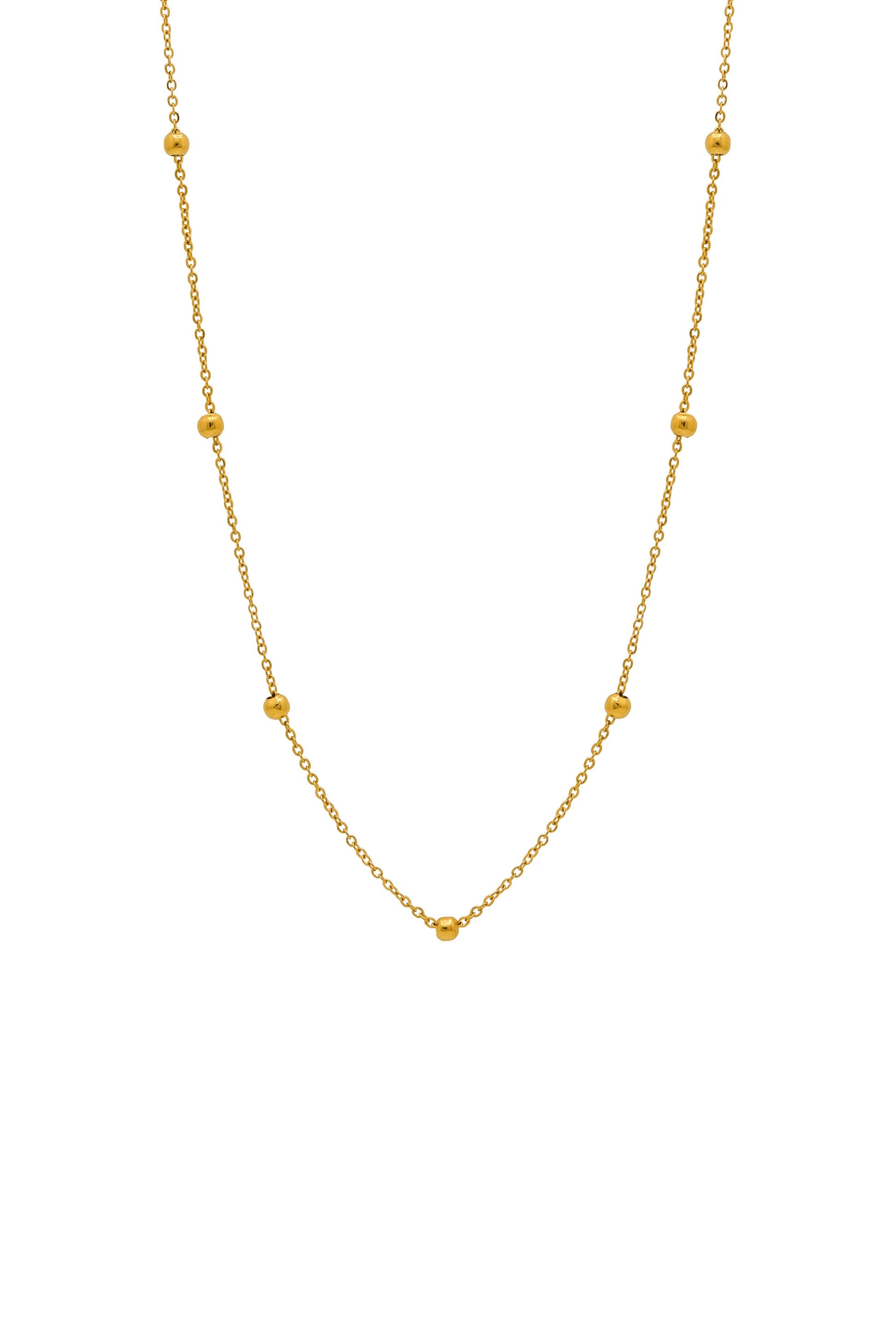 DESCRIPTION It is little wonder that delicate necklaces have made such a comeback given how easy it is to layer them with other pieces and this dainty, gold ball necklace will make your neckline pop with its thin link chain and gold ball spacing. Wear it alone with a vest top in the summer or clip on one of our lace-inspired pendants for a more unique look.