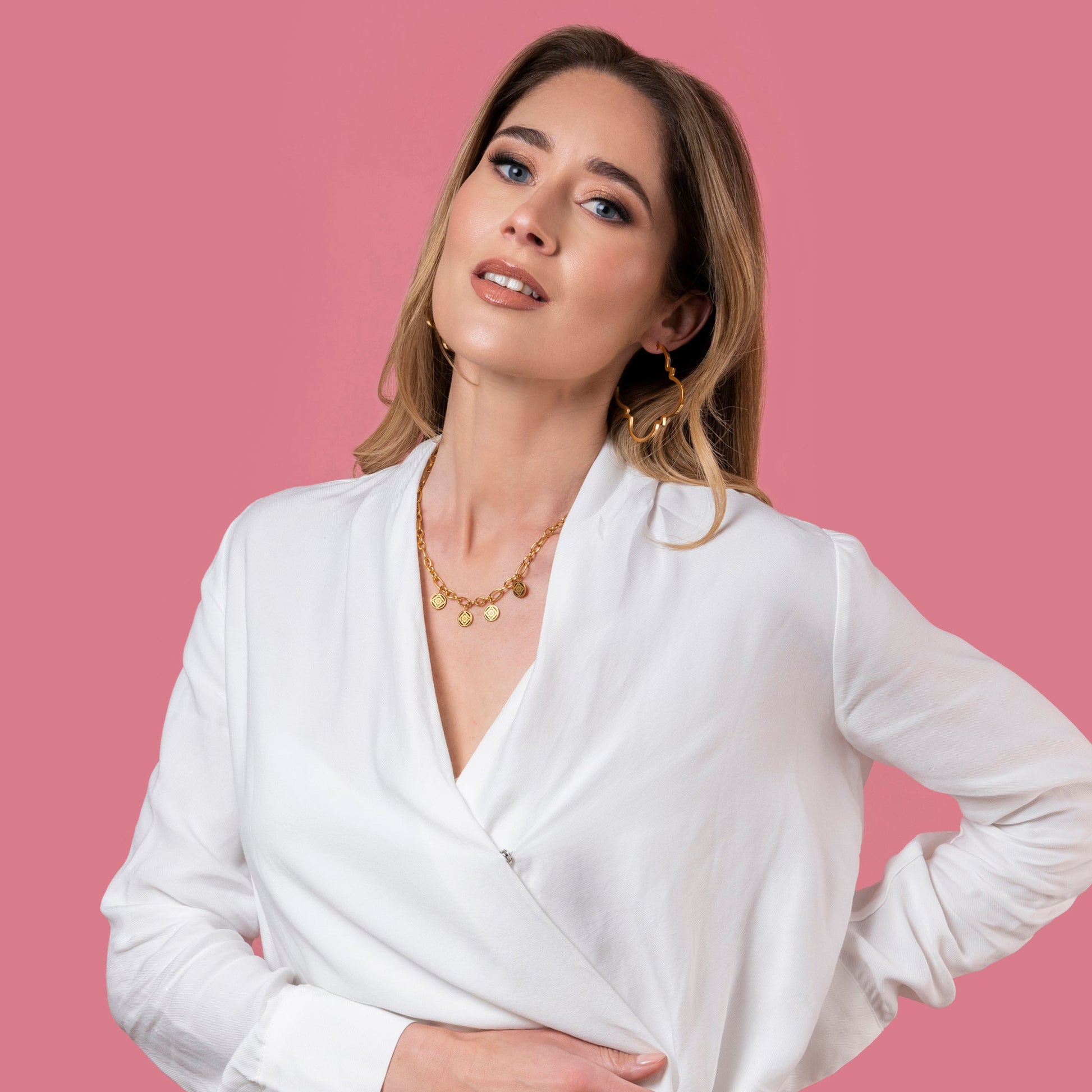 DESCRIPTION Made in gold plated stainless steel, the 'CARISMA Symbol Coin Link Necklace' is a statement piece that will complete any outfit. With a design that incorporates links with small coins that have the CARISMA symbol emblazoned on them, this piece is sure to make you stand out from the crowd.