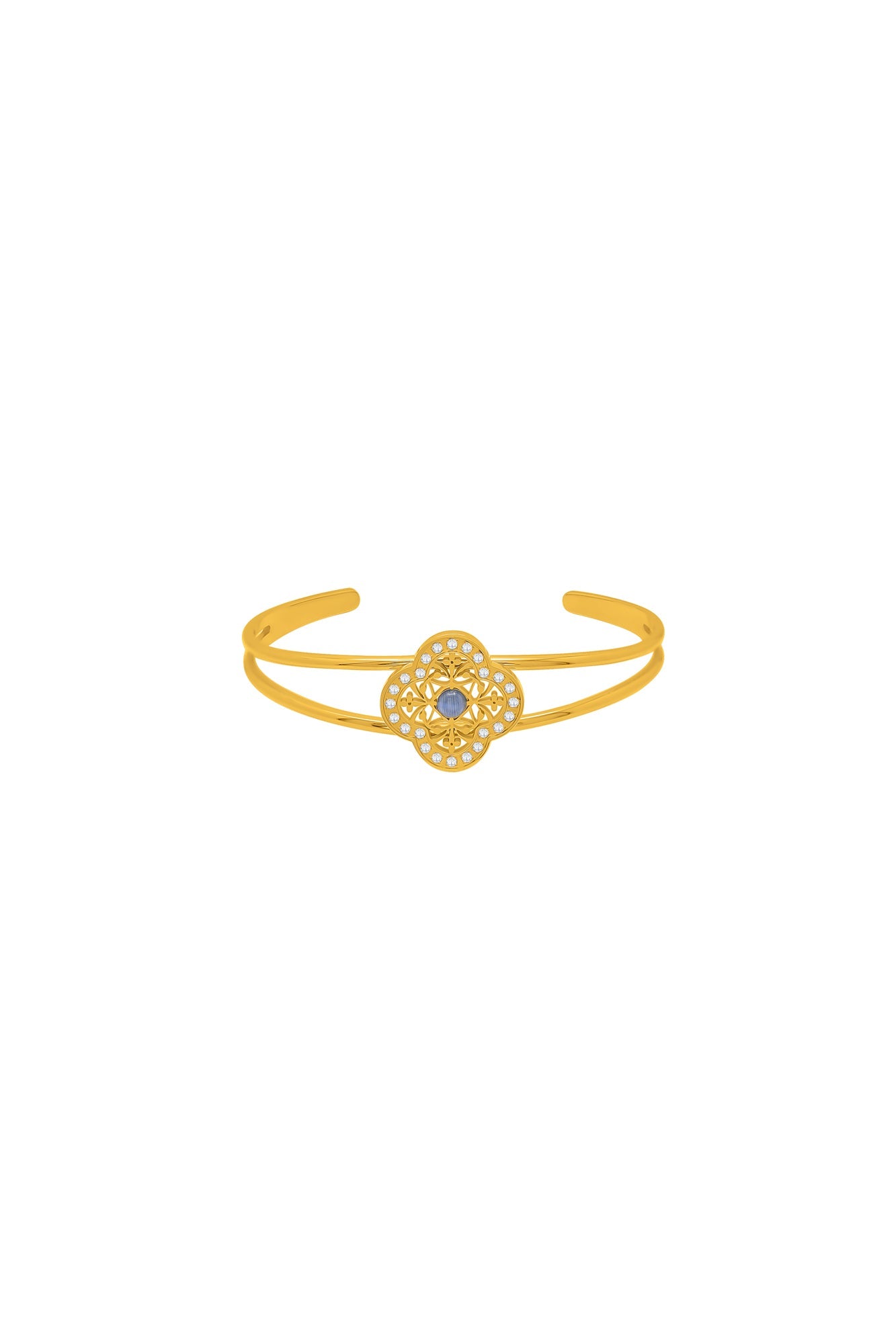 DESCRIPTION Everyone loves some arm candy, and now you can make sure that your arms get all the attention they deserve with the ‘Azure Cat Eye Bangle’. Made in gold-plated stainless steel, this bangle has two channels which merge into one and a gorgeous CARISMA symbol with a Gozo lace design and Cat Eye stone at its centre. The ultimate gift!