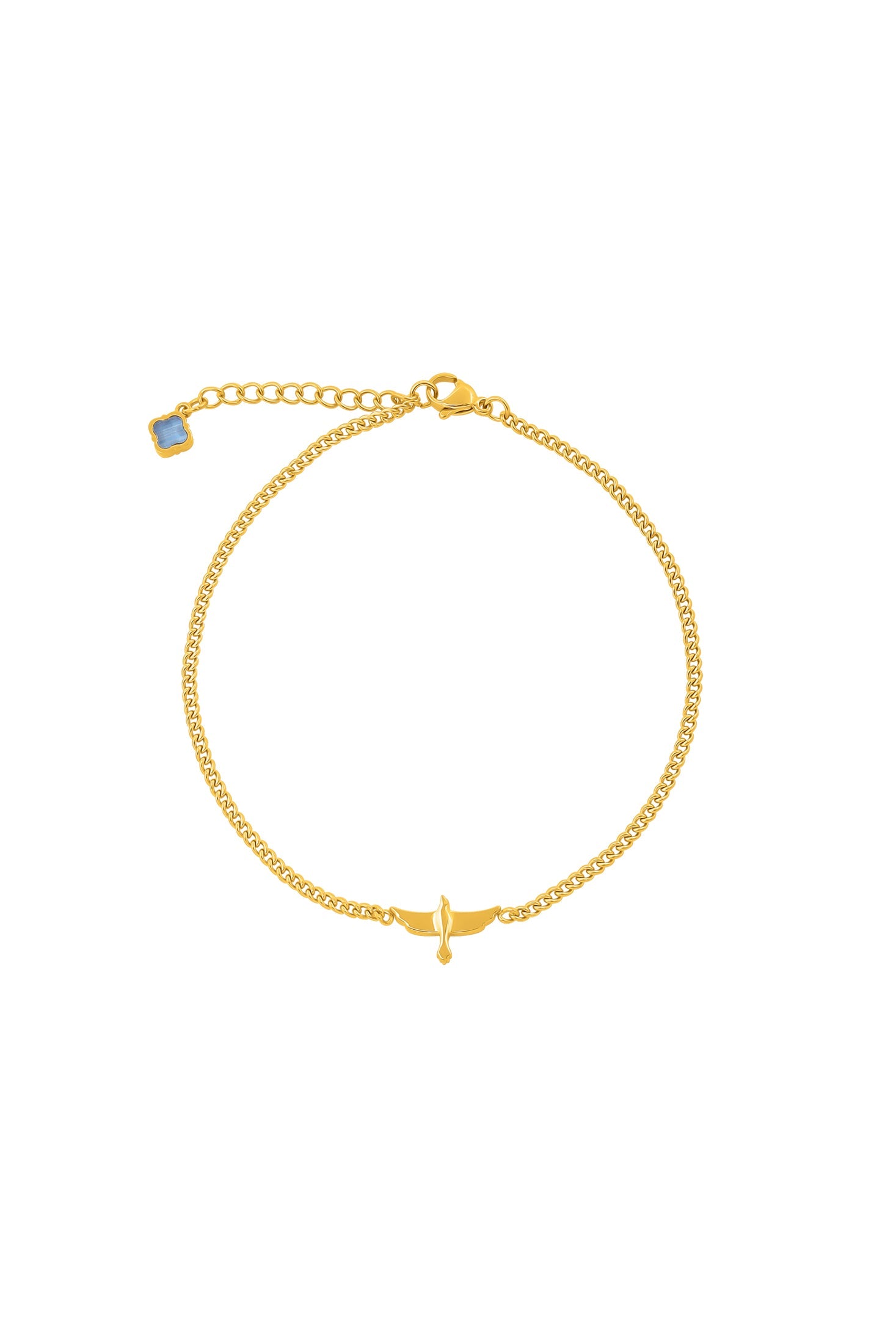 DESCRIPTION With its stainless steel gold plated thick chain, bird at its centre and blue Carisma symbol detail, the ‘Ikħal Cat Eye Anklet’ is a gorgeous, simple piece that serves to remind the wearer of the beauty of being one with nature. Wear it alone, or couple it with the ‘Ikħal Cat Eye Necklace’ for the perfect set.