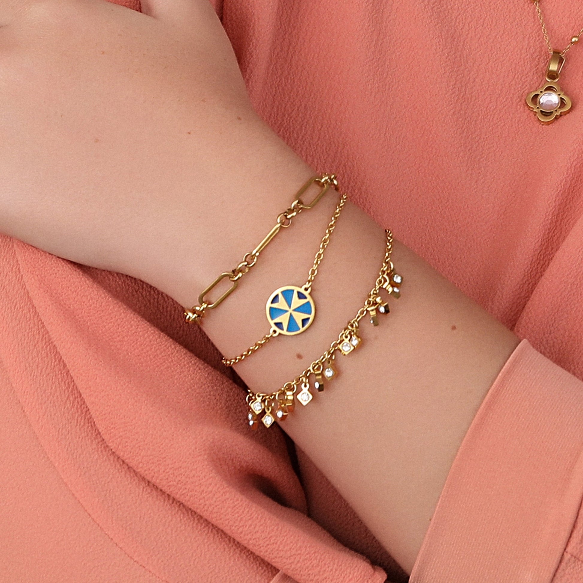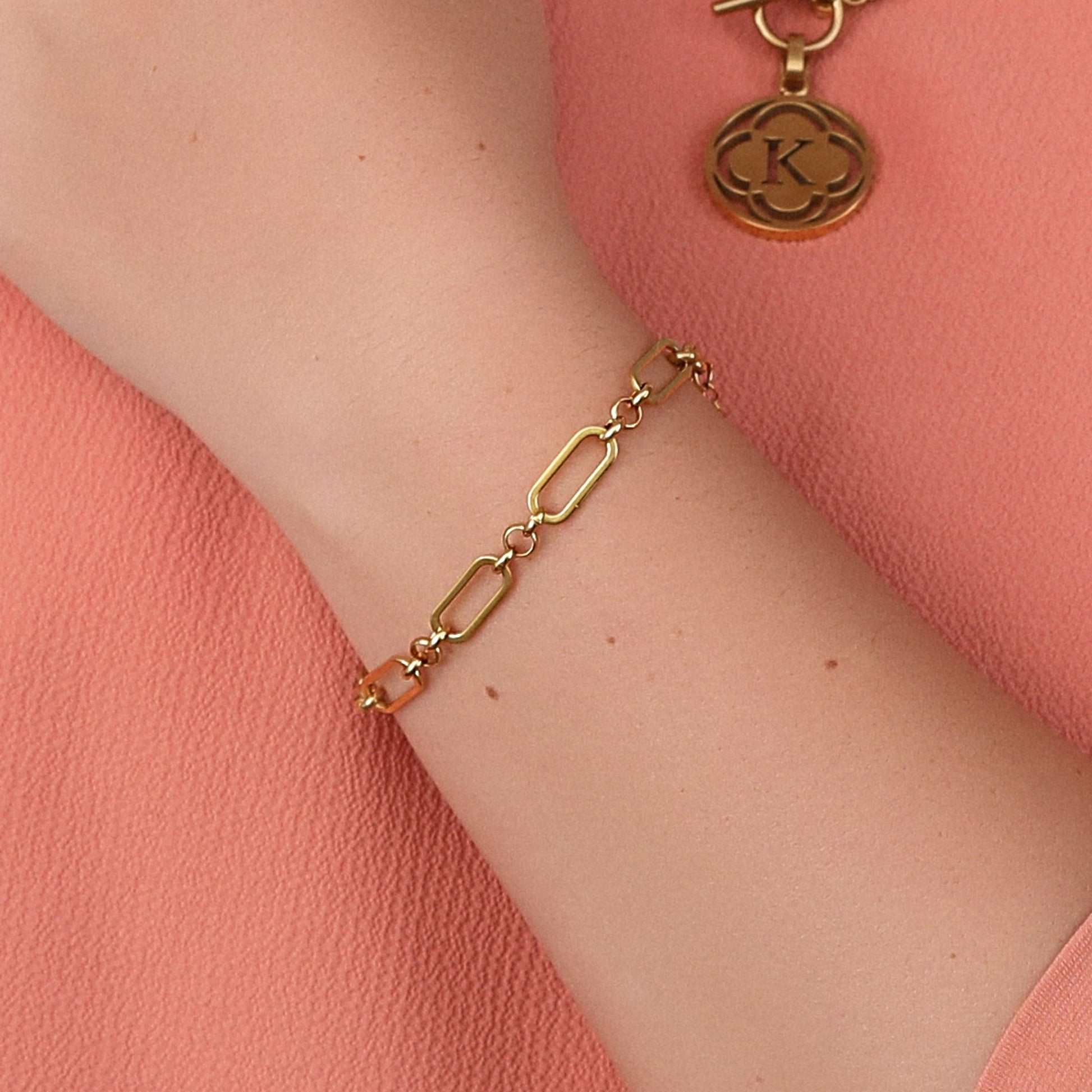 DESCRIPTION Chunky and chic, this beautiful link bracelet is a statement piece that you can wear alone or with more delicate designs. Crafted in gold plated stainless steel, this versatile bracelet will stand out whether you wear it with a simple dress or jeans and a white t-shirt.