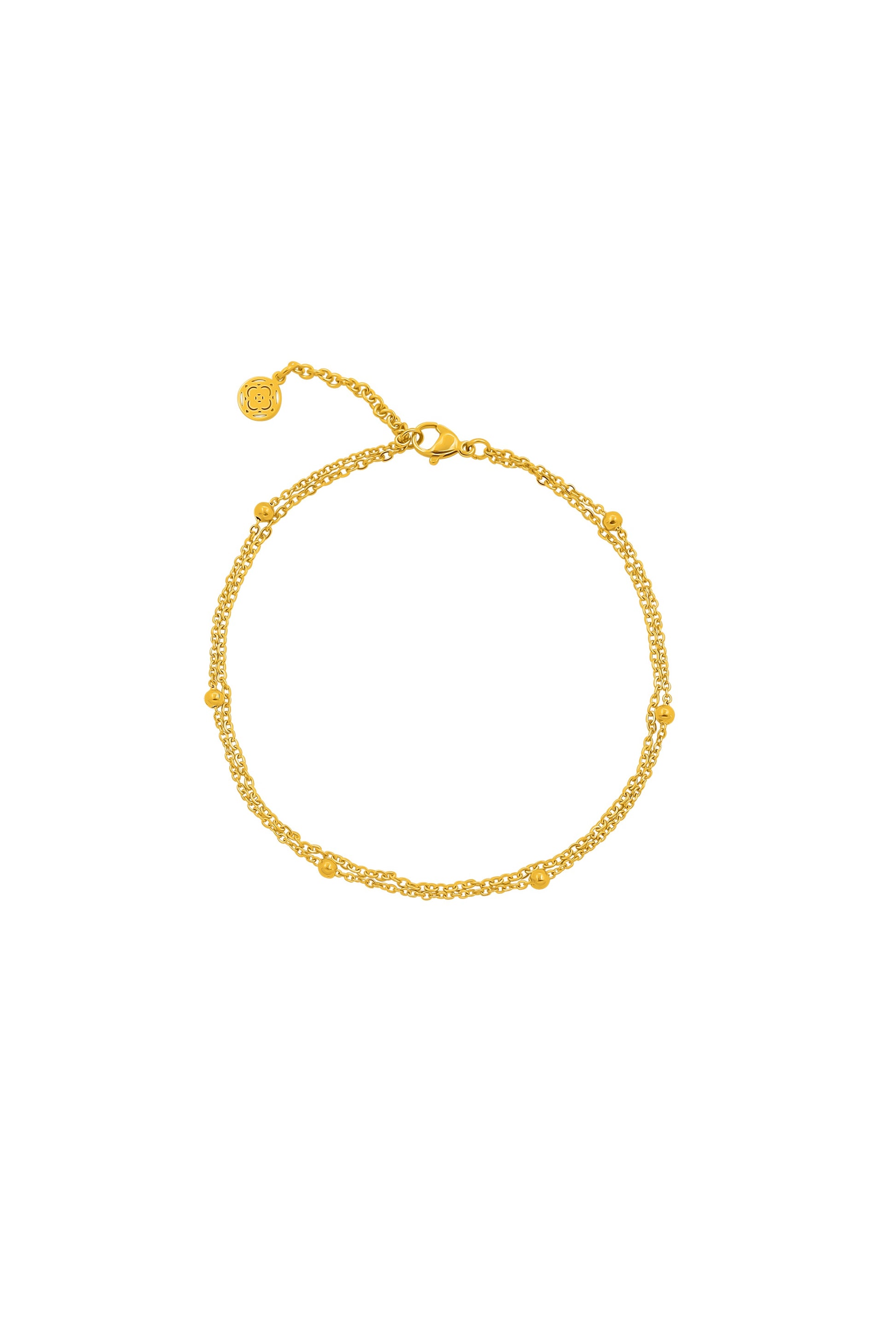Made in gold plated stainless steel, this simple yet pretty anklet will set off your summer tan in the nicest way possible. With its double chain and small spheres threaded at intervals, this design is sure to dress up any footwear you choose to wear it with.